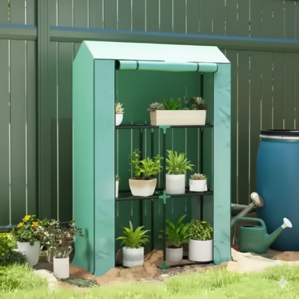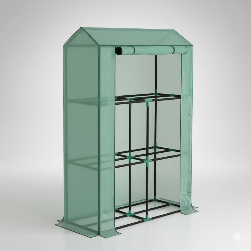Cette serre verticale compacte est conçue pour la protection des semis et la culture de plantes en pots (tomates, aromatiques) sur de petits espaces. Sa structure à étages optimise la surface de culture verticale.
